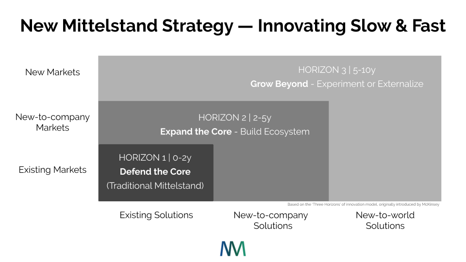 Nach dem tollen Feedback zum initialen Artikel über die Narrative #NewMittelstand geht es nun weiter ins Detail. In diesem Artikel möchte ich mich gern, wie versprochen, mit dem Thema Innovationsstrategie auf Basis des angepassten ‘Three Horizons’ Modells befassen, das ursprünglich von McKinsey vorgestellt wurde.