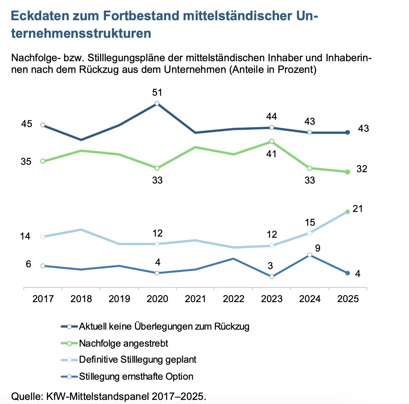 Das Nachfolge-Monitoring Mittelstand 2025 der KfW enthält einen auf den ersten Blick bemerkenswerten Widerspruch: Einerseits finden 69% der Unternehmen mit Nachfolge- bzw. Stilllegungsplänen keinen „passenden“ Nachfolger, während andererseits die Kurzfristnachfolgen (bis Ende 2026) einen „sehr guten Planungsstand“ aufweisen. Immerhin 64% haben bereits einen Kandidaten. Im Text heißt es: „Ungewollte Stilllegungen aufgrund unerfüllter Nachfolgewünsche sind aktuell seltener zu erwarten.” Wie passt das zusammen?